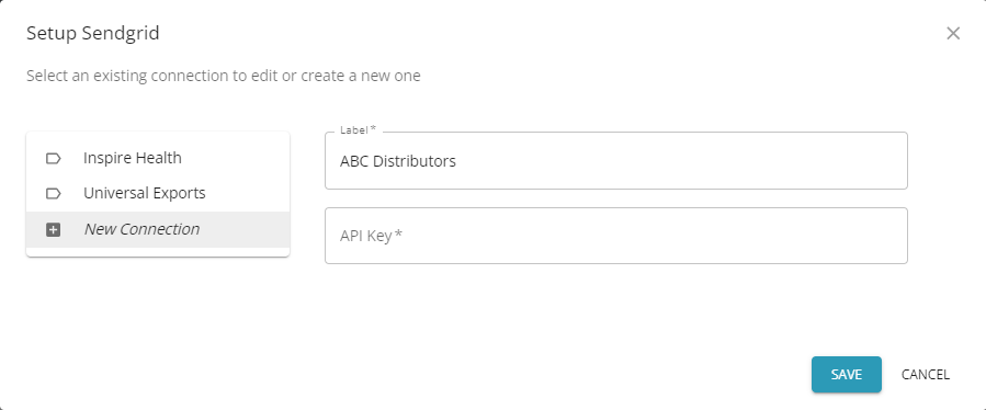• In Spire, navigate to Server Administration > Integrations, and in the Setup section, input your SendGrid company name Label and API Key.