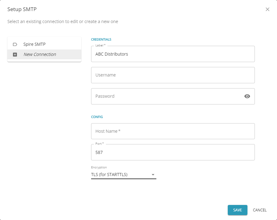• In Spire, select the SMTP option under Integrations and in the Setup section, input this address and the details as specified in your SMTP server documentation.